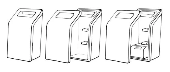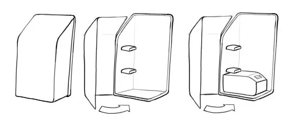 Vanwege de aanwezigheid van een scharnier voor de deksel en een handvat om de module aan vast te houden is gekozen voor de accumodule in schets 1. De schets is bewerkt tot onderstaande eindschets.