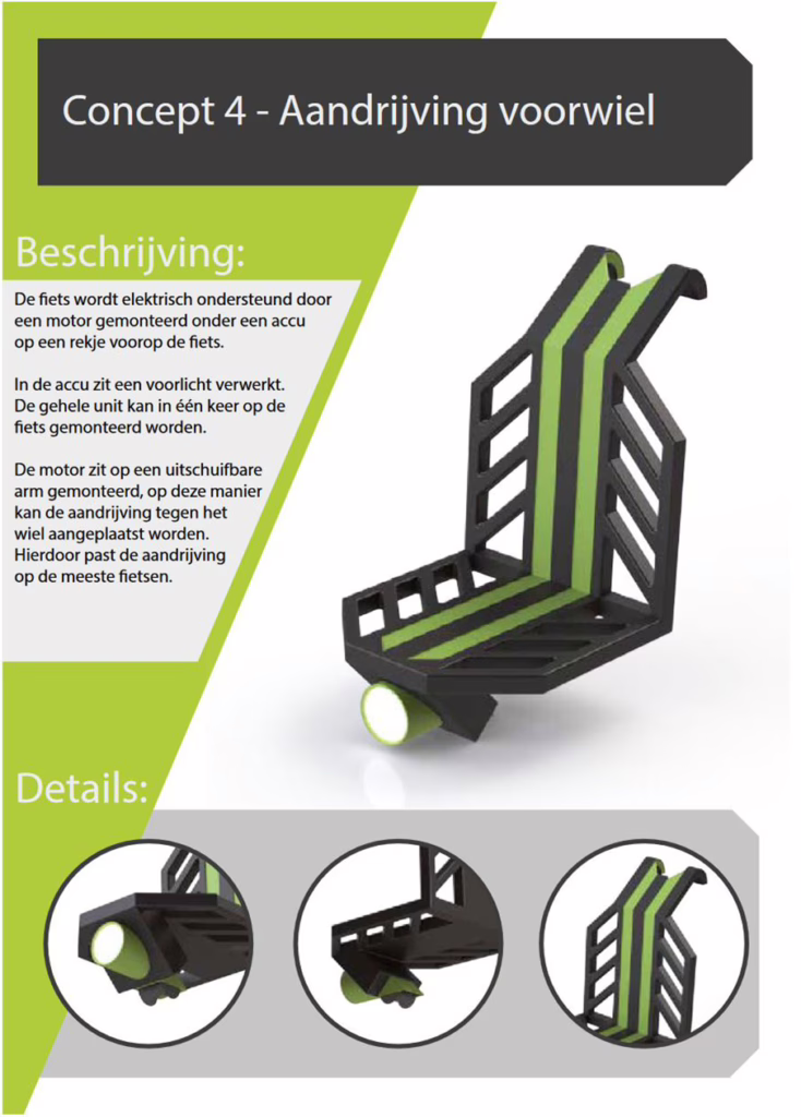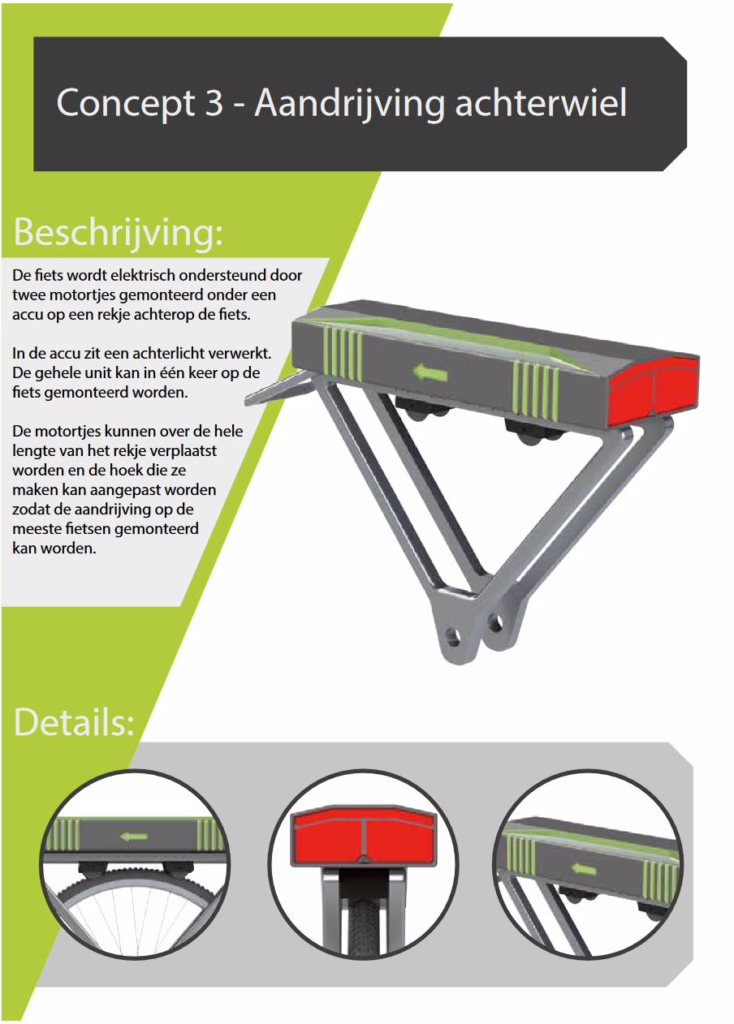 worden wat gemakkelijk te monteren is op normale bestaande fietsen. Dit zijn voornamelijk stadsfietsen. De fietsondersteuning bestaat uit grotendeels twee onderdelen, dit zijn de elektrische ondersteuning en de accu’s. Omdat de accu’s al ontwikkeld zijn ligt onze focus vooral op het ontwikkelen van de juiste en passende ondersteuning.