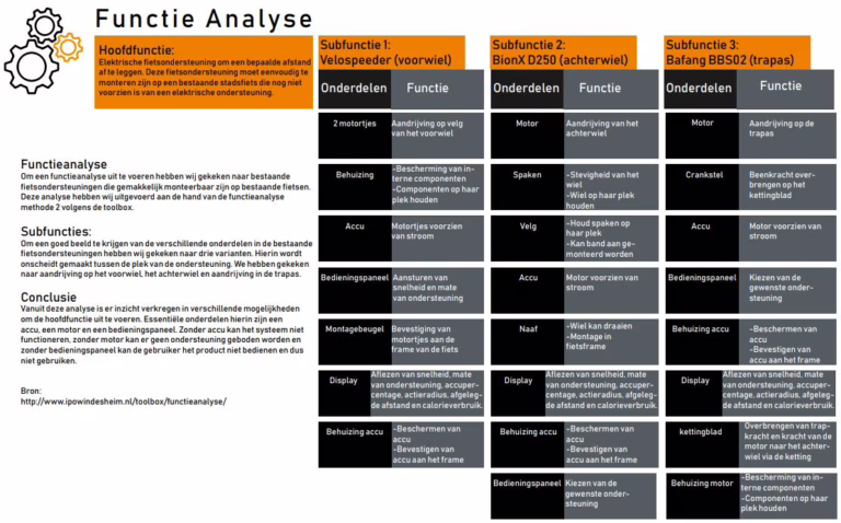 Om meer inzicht te krijgen in veel voorkomende onderdelen op de bestaande kits en de toepassing van deze onderdelen is een functieanalyse uitgevoerd. Zie onderstaande afbeelding voor de resultaten en conclusie.